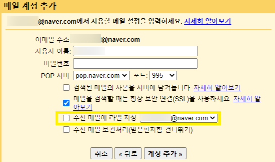 하지만 그러면 메일이 마구 섞여서 정신이 없을겁니다. [계정 추가]를 누르기 전에 가급적이면 어떤 계정에서 들어온 메일인지 자동으로 분류되도록 사진의 노란박스된 [수신 메일에 라벨 지정]에 체크하고 라벨의 이름을 지정해 주시길 바랍니다.
