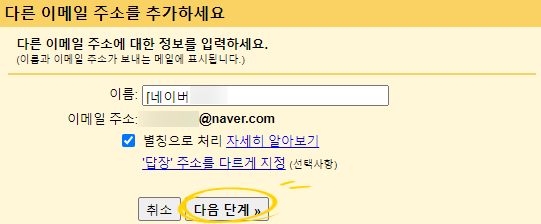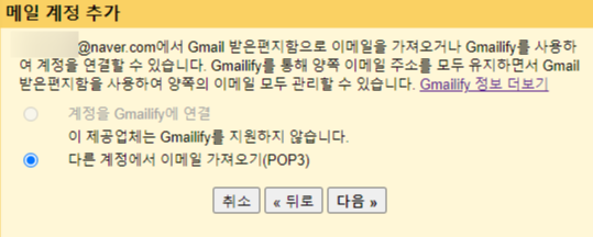 [다른 계정에서 이메일 가져오기(POP3)]을 체크하고 다음으로 넘어갑니다. 다른 계정의 이메일을 Gmail화 시키는 Gmailify는 네이버 메일에서는 쓸 수 없습니다.