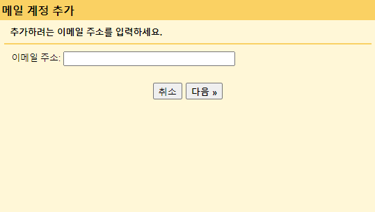 [모든 설정 보기]로 들어오면 상당히 많은 메뉴가 뜨지만 그중 [계정 및 가져오기]를 선택하여 중간에 [다른 계정에서 메일 확인하기] 항목에 있는 [메일 계정 추가]를 선택하면 아래와 같이 계정 추가 화면이 팝업됩니다.