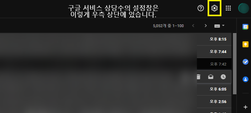대부분의 설정, 옵션 기능이 왼쪽에 붙어있는 네이버 메일과는 다르게 구글 Gmail의 설정은 우측 상단에 있습니다.