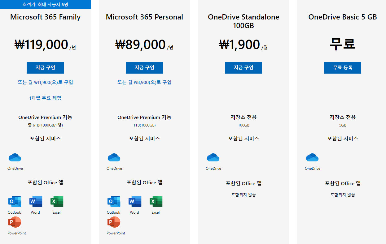 1테라의 넓은 저장 공간에 오피스 앱을 모두 포함하는 퍼스널 패키지부터, 119,000원에 오피스와 6테라의 저장공간 최대 6명의 동시사용을 지원하는 패밀리 요금제까지 넘어가면 원드라이브의 가성비는 네이버 마이박스를 압살하고도 남는 수준이 됩니다.