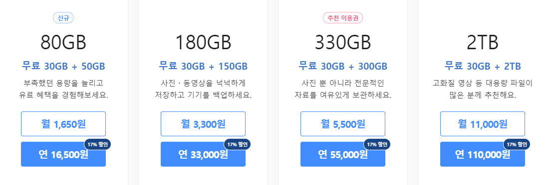 용량이 모자랄 시에 추가로 사용할 수 있는 스토리지의 가격이 최저 1650원에 50기가를 추가로 제공하여 총 80기가를 확보할 수 있고 월 1만원 정도의 사용료를 내면 2테라의 용량을 사용할 수 있어 대량의 데이터를 가진 유저도 사용 할 수 있습니다.