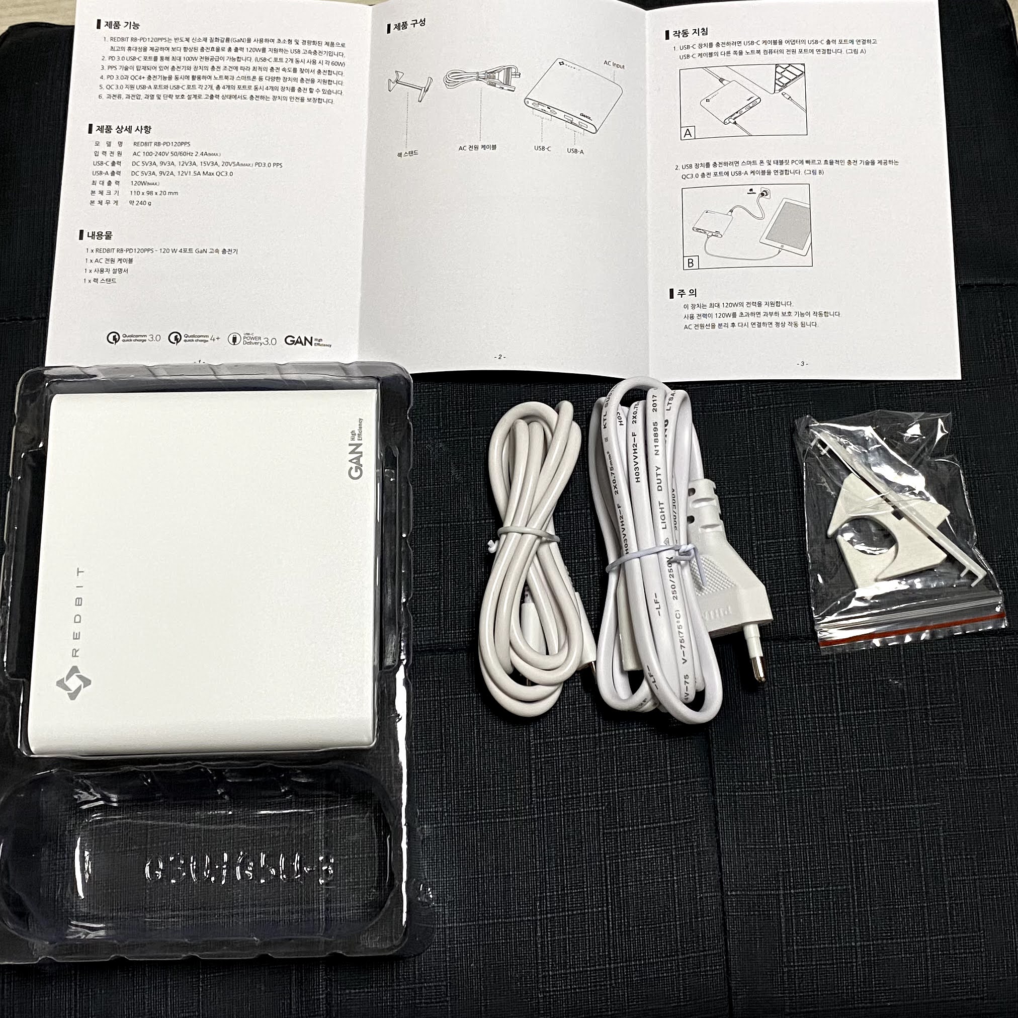 패키지 내부에는 충전기 본품과 전원 케이블, 거치용 지지대와 함께 사은품인 PD 충전용 100W USB-C 타입 케이블이 들어있습니다. 사은품 케이블이 보이지 않아서 연락을 해봐야 하나 했는데, 패키지 내부에 동봉되어 있군요...
